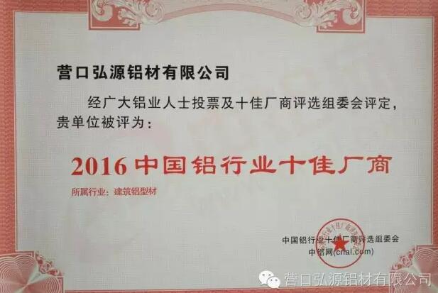 弘源鋁材榮獲中國建筑鋁型材十佳廠商